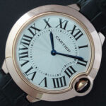 文字盤: ホワイト文字盤、ブラックインデックス、ローマ字時字(7時ローマ字にカルティエロゴがあり)
