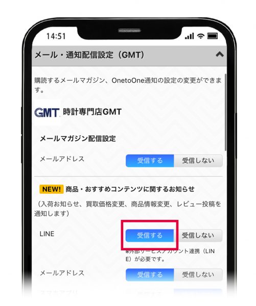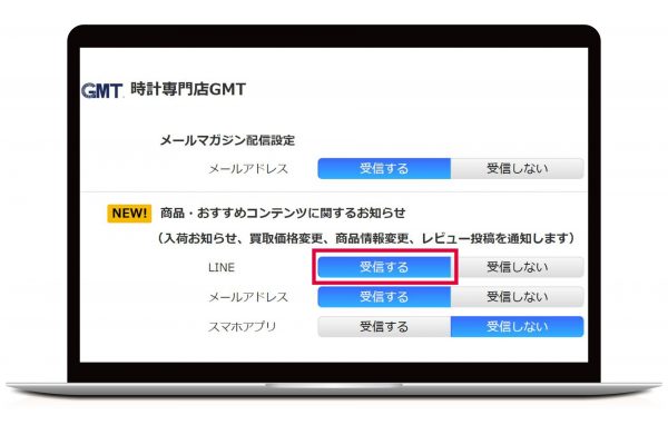 ※GMT公式アカウントの友だち登録がまだの方、ID連携がまだの方は「LINE連携して受信する」で友だち登録+ID連携+受信設定が全て完了されます。