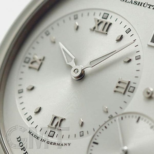 アシンメトリーな文字盤の配置は、黄金比が随所に用いられ、一目でランゲ1であることが認識できる特徴的なデザイン。